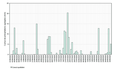 Les sols se sont réhumidifiés au milieu de l’été, à la suite des orages de fin juin et des précipitations excédentaires de juillet, avant un nouvel asséchement très prononcée en août, jusqu’au 28. Le rafraîchissement et les pluies de fin août ont ensuite permis de réhumidifier les sols, permettant un retour à la normale à la fin d’été.