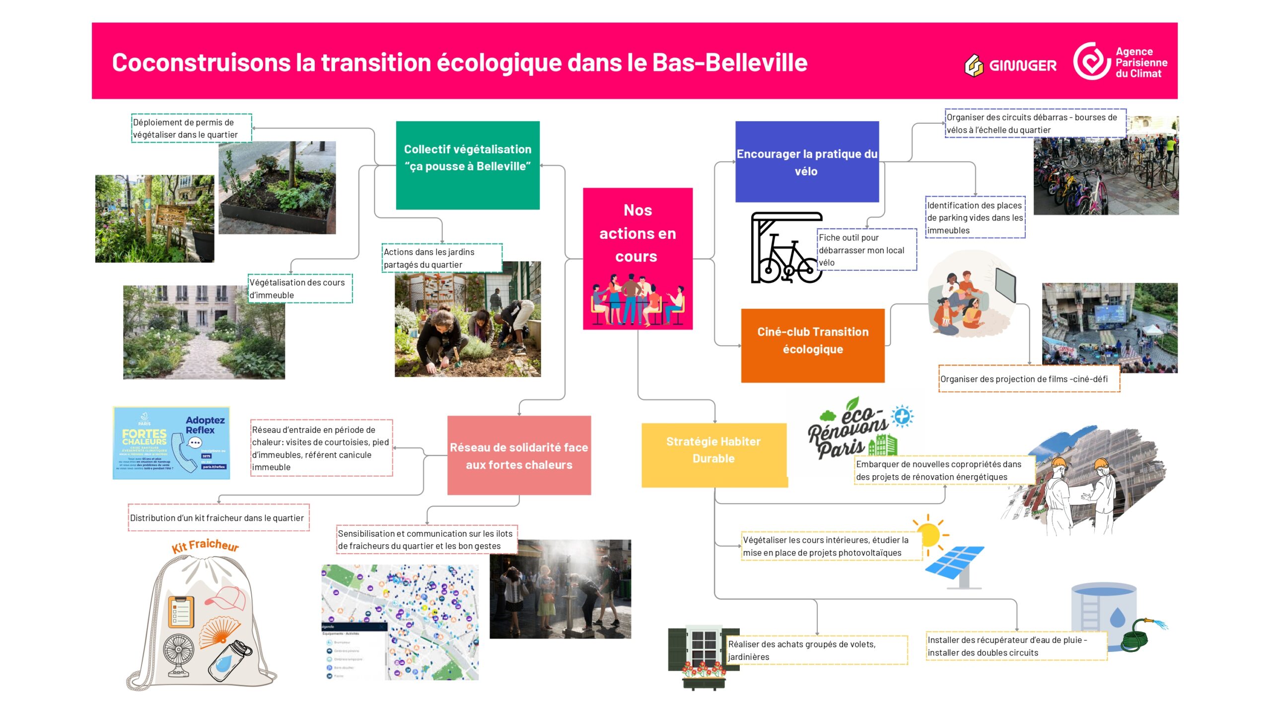 Dans le cadre du projet GINNGER, l’Agence Parisienne du Climat accompagne les habitants et habitantes du quartier du Bas-Belleville dans leurs projets en lien avec la transition écologique. Mobilités douces, rénovation énergétique, végétalisation, solidarité, confort d’été et d’hiver, partage et don, les thématiques sont très vastes et choisies par les habitant·es.
