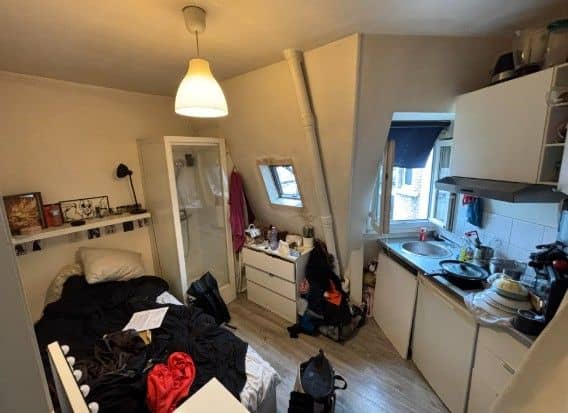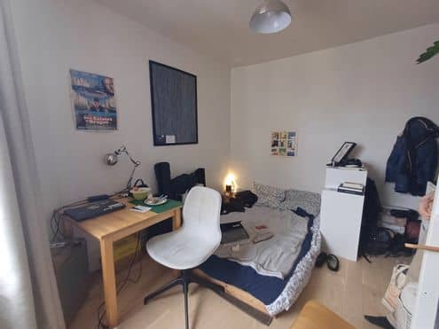Antoine habite au cinquième et dernier étage d’un immeuble haussmannien dans le 19ᵉ arrondissement. Son logement a une superficie de 15 m² pour un loyer de 670 €.