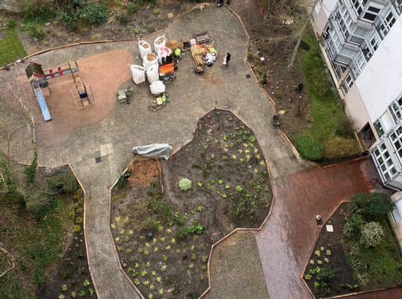 Cependant, il restait une surface importante d’espaces minéralisés : les personnes vivant dans la copropriété y avaient très chaud en été. C’est cela qui a motivé les copropriétaires à aller plus loin dans la végétalisation de la cour : un 1er diagnostic réalisé en 2019 leur a confirmé que les espaces verts actuels étaient vieillissants et qu’il était possible de rafraîchir la cour en augmentant de 20 % la surface plantée.